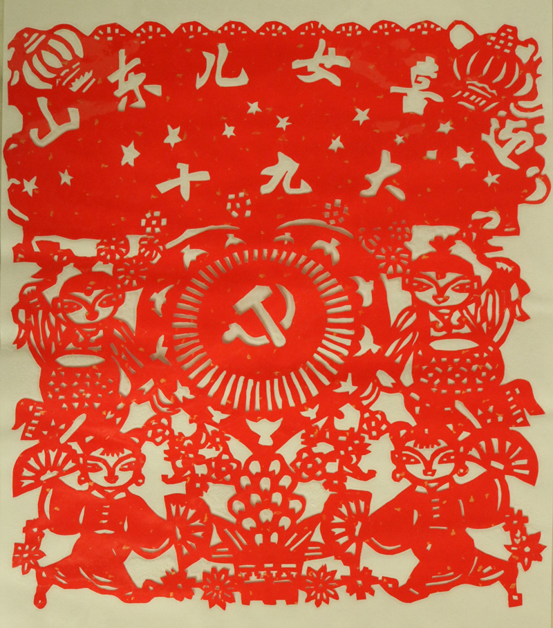 本作品上半部分是“山東兒女喜迎十九大”的字樣,下半部分是四個青年學生圍著花束上的黨徽,身為山東的青年大學生用自己的方式學習黨的十九大精神。