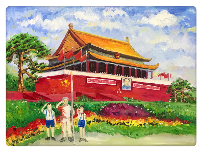 不忘初心,牢記使命,中國(guó)共產(chǎn)黨歷經(jīng)百年滄桑成為現(xiàn)今最偉大的政黨,人民最值得信賴的依靠。天安門城下,見證了共產(chǎn)黨從弱小變強(qiáng)大的坎坷歷程,自新中國(guó)成立以來(lái),這個(gè)政黨每一天都在以最飽滿的姿態(tài)迎接?xùn)|方的朝陽(yáng)。畫中以天安門城墻為主景,城墻下老將軍舉國(guó)旗行軍禮,左右兩位少先隊(duì)員行少先隊(duì)禮,致敬偉大祖國(guó),致敬中國(guó)共產(chǎn)黨,致敬中華人民在中國(guó)共產(chǎn)黨的帶領(lǐng)下即將實(shí)現(xiàn)的中華民族的偉大復(fù)興。城墻兩側(cè)的青松,持重祥和,沉穩(wěn)靜謐,滿滿“地維賴以立,天柱賴以尊”的浩然正氣。代表黨的十九大后,全黨人民努力全面建成小康社會(huì),實(shí)現(xiàn)中華民族的偉大復(fù)興的決心。大雪壓青松,青松挺且直。要知松高潔,待到雪化時(shí)。十九大結(jié)束之際,僅以此畫獻(xiàn)給十九大,獻(xiàn)給中國(guó)共產(chǎn)黨,感恩中國(guó)共產(chǎn)黨一路走來(lái)努力帶領(lǐng)人民邁向小康,致敬在中國(guó)共產(chǎn)黨的帶領(lǐng)下即將實(shí)現(xiàn)的中華民族的偉大復(fù)興。