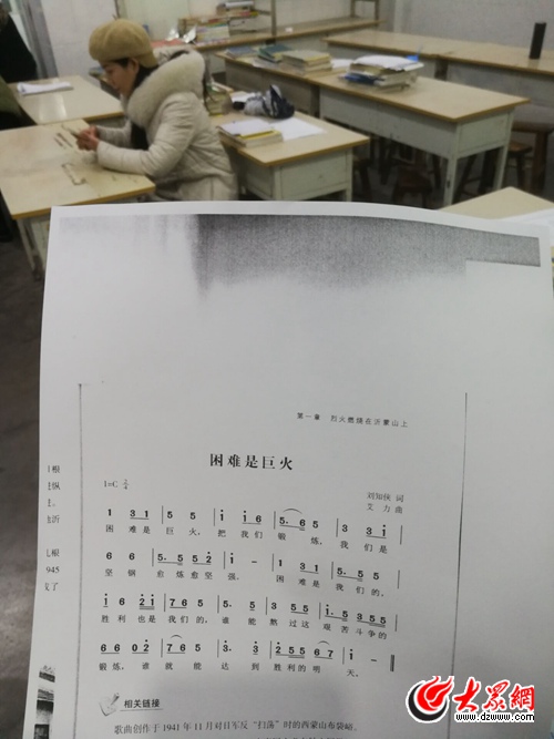 大眾網臨沂12月3日訊 抗日戰爭最艱苦時期,在沂蒙山區和根據地干部中流傳著一首紅歌。曾親身經歷過抗日戰爭的大眾日報社原總編輯辛冠潔將這首歌稱為“能代表大眾日報精神的一首歌”,能讓他想起烽火歲月,極大鼓舞了軍民的士氣。但辛老和大眾日報社同志只知道歌曲的片段,不知道完整的歌詞和曲譜,連歌名和作者都不知道。辛老在大眾日報報史館館長于岸青文章中看到歌詞片段,勾起深情回憶,就委托于岸青發掘這首歌。直到于岸青找到沂南的秦丕山老師,這首歌才在及歷史煙塵中再度展現清晰、完整的容顏。這首歌就是《困難是巨火》。