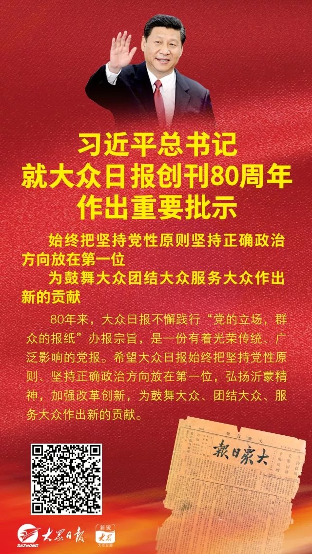 2018年12月31日,習近平總書記就大眾日報創刊80周年作出重要批示。全文如下: