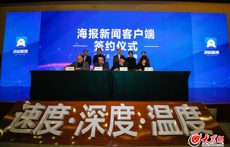山東省互聯網傳媒集團與廳局代表、海報號入駐代表簽訂“海報新聞”政府頻道開通協議和入駐協議。