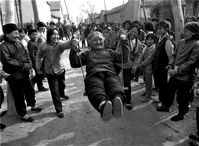 1994年,山東省濱州市舊鎮有清明節蕩秋千的風俗,生活富裕起來農民又開始在村子里扎起了秋千。年邁的老人們仿佛又回到了少年時代,重溫起了女兒夢。(央廣網發 李楠 攝)