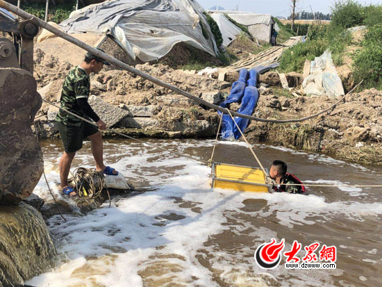 隨后,記者途徑308國道東方村路段時,為給大棚抽水,一名消防戰士怕抽水口堵塞,跳到水坑中徒手清理抽水口的雜草和垃圾,另一名戰士在水坑旁邊緊張關注,以備救援。這兩名戰士均來自青島消防,在這里搶險救災已兩天兩夜。