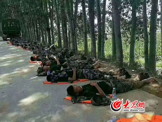 8月25日上午,在受災較重的羊口鎮大宅科村附近,連續六天參與搶險救災的消防官兵在路邊休息。