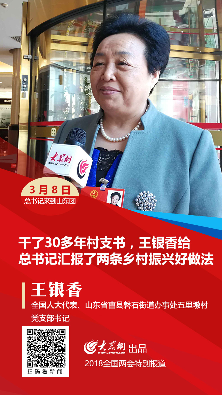 大眾網北京3月8日訊(特派記者 樊思思)“能當面給總書記匯報工作,我感到非常激動,非常高興!”3月8日是國際婦女節,對于全國人大代表、山東省曹縣磐石街道辦事處五里墩村黨支部書記王銀香來說,這一天不僅是她的節日,更是一個讓她激動萬分的特殊日子。今天上午,中共中央總書記、國家主席、中央軍委主席習近平來到十三屆全國人大一次會議山東代表團參加審議。王銀香圍繞強化基層黨組織建設、推動鄉村振興作了發言,現場講起了帶領農民發展產業、致富奔小康的故事。