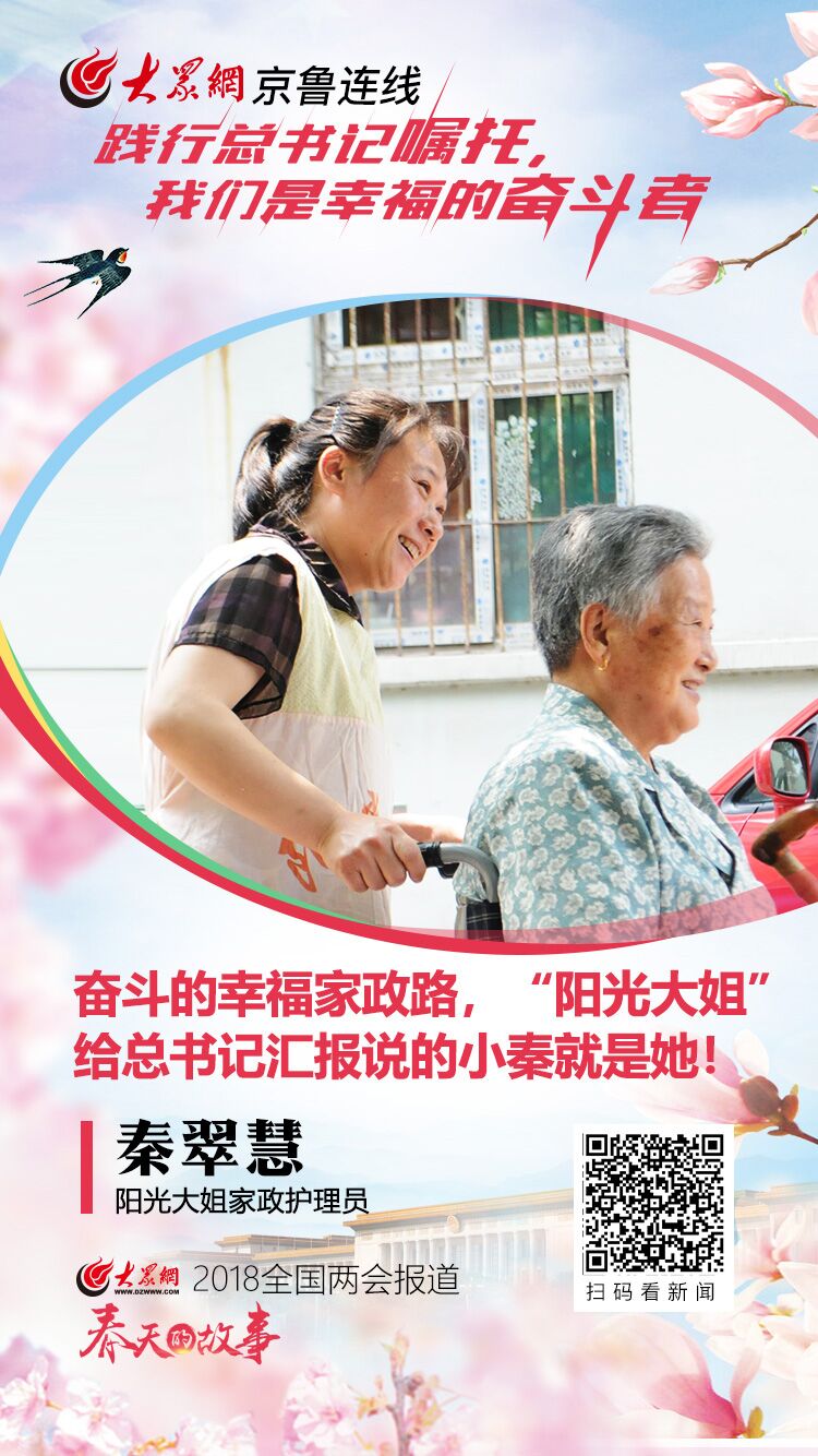 3月8日上午,“陽光大姐”卓長立向習總書記匯報了養(yǎng)老服務(wù)員小秦“一人就業(yè)全家脫貧”的故事。卓長立說的“小秦”,就是秦翠慧。8日晚,大眾網(wǎng)記者在濟南陽光大姐總部見到了“小秦”。