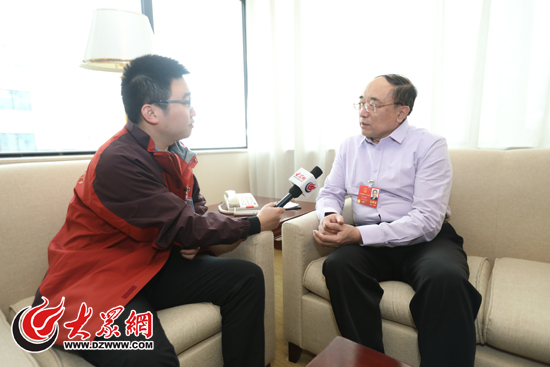 大眾網記者采訪全國人大代表、中國工程院院士、山東省腫瘤防治研究院院長于金明。(亓翔 攝)