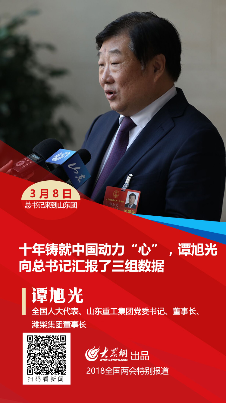 大眾網(wǎng)北京3月8日訊(特派記者 王磊 趙洪棟)3月8日上午,中共中央總書(shū)記、國(guó)家主席、中央軍委主席習(xí)近平來(lái)到十三屆全國(guó)人大一次會(huì)議山東代表團(tuán)參加審議。在代表們發(fā)言時(shí),全國(guó)人大代表、山東重工集團(tuán)黨委書(shū)記、董事長(zhǎng)、濰柴集團(tuán)董事長(zhǎng)譚旭光,向習(xí)總書(shū)記匯報(bào)了過(guò)去十年濰柴立足裝備制造主業(yè)不動(dòng)搖,靠創(chuàng)新實(shí)現(xiàn)轉(zhuǎn)型發(fā)展的三組數(shù)據(jù)。