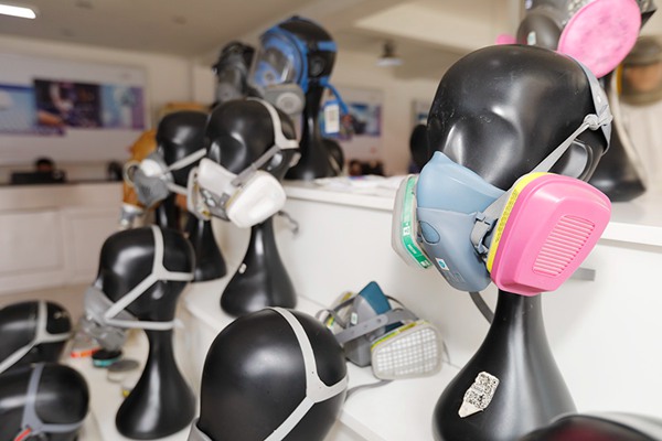 工作人員向記者介紹勞保用品。