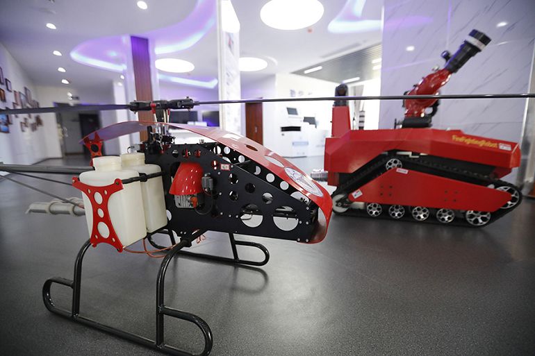 浙大山東工研院展廳中展出的特種無(wú)人機(jī)及機(jī)器人。