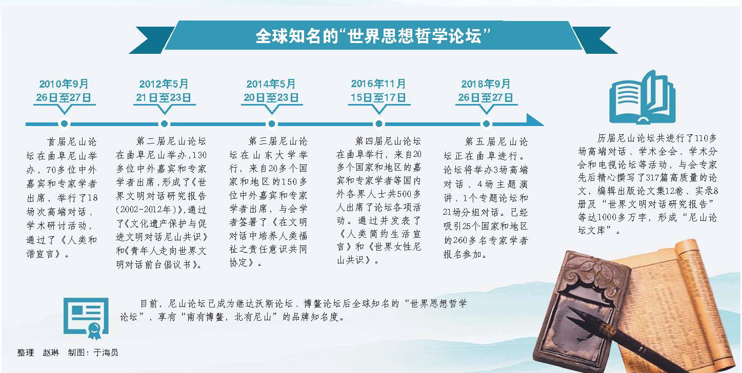 尼山世界文明論壇(簡稱“尼山論壇”),是以中國古代偉大的思想家、教育家孔子誕生地——尼山命名,以開展世界不同文明對話為主題,以弘揚中華優秀文化、促進中外文化交流、推動建設人類命運共同體為目的,學術性、國際性與開放性相結合的國際思想文化對話交流平臺。