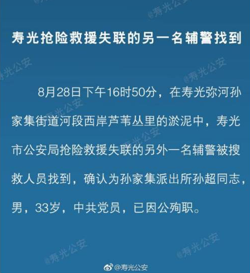 8月20日凌晨,壽光市公安局兩名輔警在搶險救援時,被洪水沖走失聯。28日晚,壽光公安通過官方微博通報,搶險救援的另一名輔警孫超(男,33歲)已在壽光彌河孫家集街道河段西岸蘆葦叢里的淤泥中被找到,已因公殉職。 [詳細]