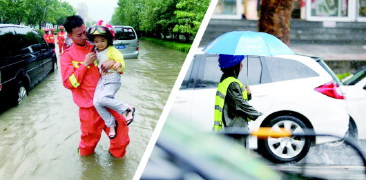 左圖:聊城消防隊員抱著一名兒童穿越積水馬路。(大眾報業記者 郭慶文 報道) 右圖:濟南市政工作人員冒雨引導車輛繞開施工路段。(記者 王世翔 報道)