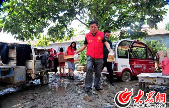 29日上午,在王新航的帶領下,山東各地新階層的代表們一大早從濟南、濰坊、臨沂、菏澤、淄博等地,駕車先后來到上口鎮口子村和營里鎮黑冢子村,給搶險救災一線的消防官兵和當地村民們送去了牛奶、面包和煎餅等慰問品。