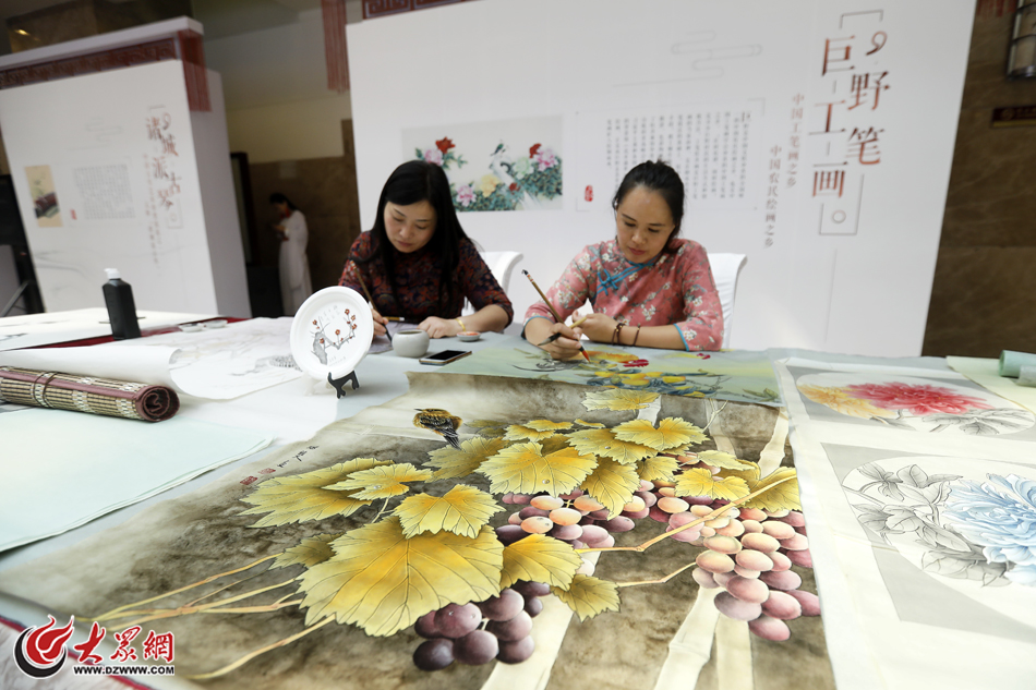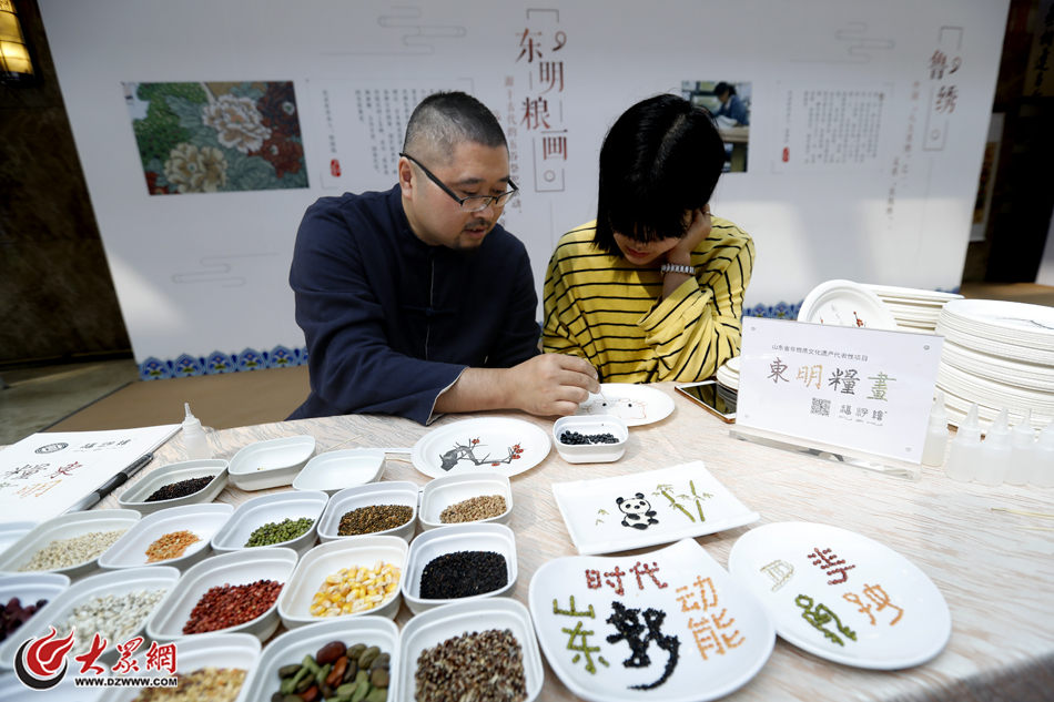下午兩點,儒商大會非遺展區里觀展的嘉賓絡繹不絕,德州扒雞、東明糧畫、楊家埠年畫等山東傳統文化的非遺傳承人們也拿出各自絕活,將最完美的藝術品呈現在嘉賓們眼前。在各非遺攤位前,有嘉賓還不時詢問著這些藝術品是否能購買留念。