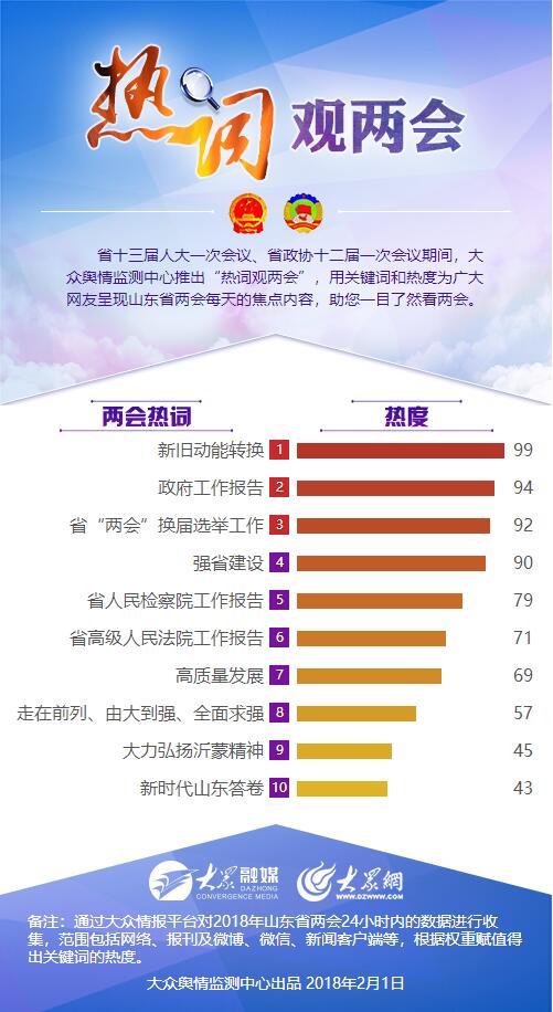 大眾網(wǎng)2月1日訊 省十三屆人大一次會(huì)議、省政協(xié)十二屆一次會(huì)議期間,大眾輿情監(jiān)測(cè)中心推出“熱詞觀兩會(huì)”欄目,每天選出10個(gè)熱詞為廣大網(wǎng)友解讀“兩會(huì)”。通過(guò)對(duì)9天來(lái)的網(wǎng)絡(luò)信息進(jìn)行梳理發(fā)現(xiàn),“新舊動(dòng)能轉(zhuǎn)換”熱度最高,成為2018年山東省“兩會(huì)”的最熱詞。