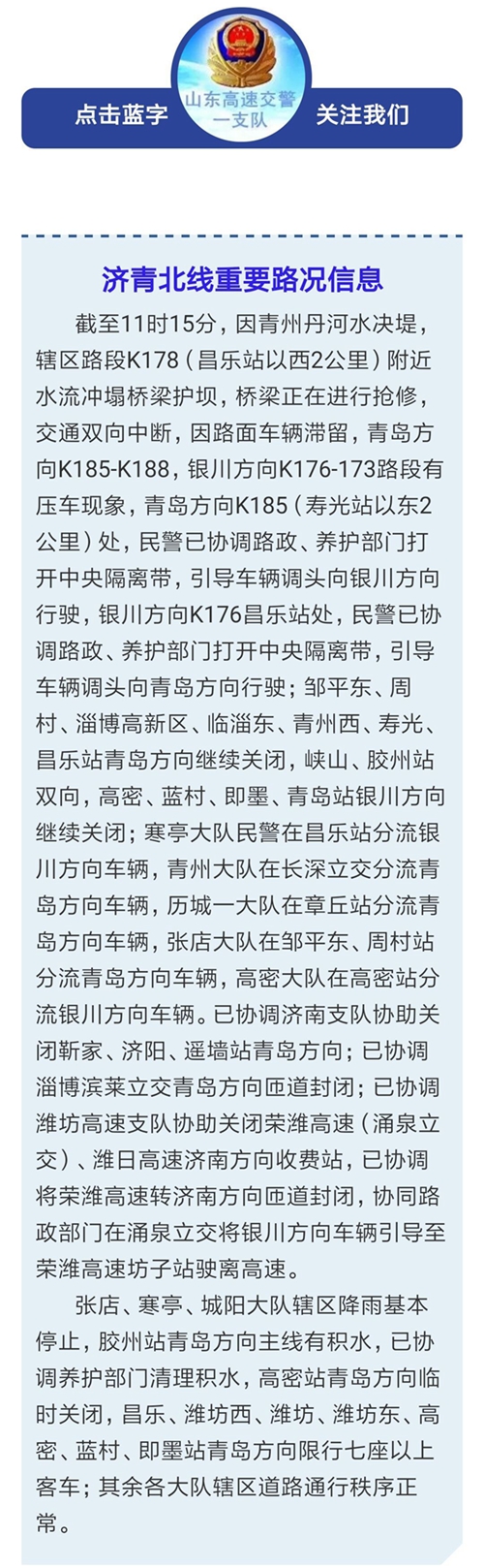 鄒平東、周村、淄博高新區、臨淄東、青州西、壽光、昌樂站青島方向繼續關閉,峽山、膠州站雙向,高密、藍村、即墨、青島站銀川方向繼續關閉。同時,高速交警一支隊已協調濟南支隊協助關閉靳家、濟陽、遙墻站青島方向;已協調淄博濱萊立交青島方向匝道封閉;已協調濰坊高速支隊協助關閉榮濰高速(涌泉立交)、濰日高速濟南方向收費站,已協調將榮濰高速轉濟南方向匝道封閉。高密站青島方向臨時關閉,昌樂、濰坊西、濰坊、濰坊東、高密、藍村、即墨站青島方向限行七座以上客車。