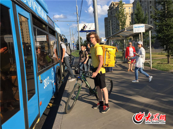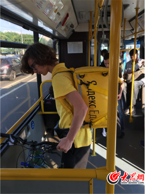 大眾網特派記者注意到,莫斯科的外賣小哥大多是二三十歲的年輕人。上圖中的這個外賣小哥文質彬彬,頗有文藝范兒。他騎著自行車送外賣,恰好來了一路34路公交車,于是他就推著自行車徑直上了公交車,他沒有投幣或刷卡。顯然,外賣公司與公交公司應該有協議的。