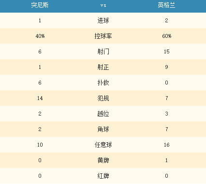 第3分鐘,亨德森長傳,阿里插上禁區(qū)右肋傳中被后衛(wèi)攔截,阿里在禁區(qū)右肋把后衛(wèi)腳下球捅向中路,無人防守的林加德8碼處射門被哈桑撲出底線。第4分鐘,阿里妙傳,林加德插上禁區(qū)左肋面對出擊的門將橫傳,后點斯特林面對空門近距離射門居然打偏了,同時邊裁示意林加德越位。突尼斯門將哈桑在出擊中撞傷了肩膀,經過治療后他繼續(xù)比賽。