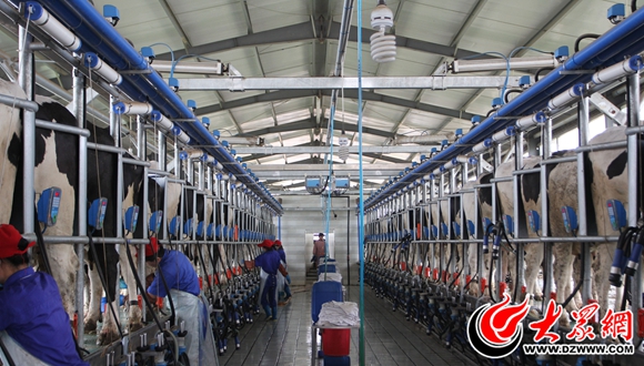 擠奶廳內,數名工人忙著擠奶