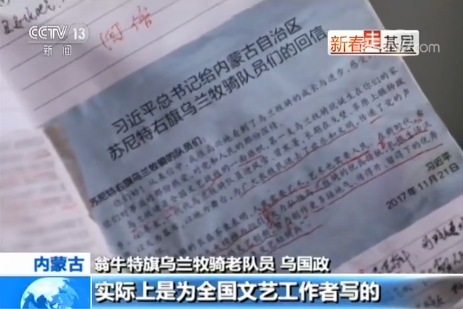 翁牛特旗烏蘭牧騎老隊員 烏國政:習近平主席這個回信,感動得我們老隊員兩三宿都沒睡覺,有的哭,說是給烏蘭牧騎實際上是為全國文藝工作者寫的,中心意思,就是號召文藝界都要下基層為群眾服務,以人民為中心,要搞好創造。