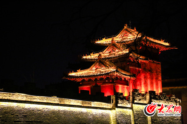 圖為泰山東街一角,雕刻的巨龍在燈光的照射下栩栩如生。