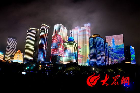 上合青島峰會的舉行讓青島的夜景一舉成名。天為幕、海為臺、城為景,數十棟高樓組成的“大屏”流光溢彩,動畫的方式營造出歡樂的燈光海洋,獨具一格的燈光秀讓青島浮山灣成為“網紅”。青島浮山灣區域美輪美奐的夜景“上線”后,每日吸引眾多市民、游客“打卡”賞景。
