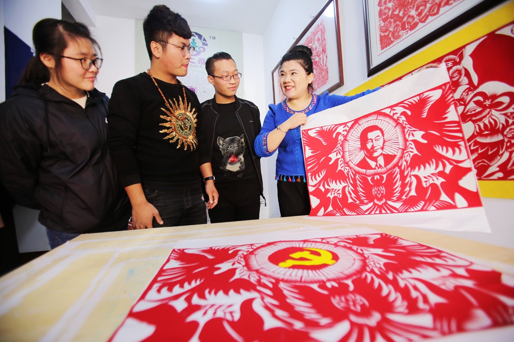 10月19日,我市“非遺”剪紙項目代表性傳承人石洪霞正在向市民展示剪紙作品。為歡慶黨的十九大的勝利召開,日前,石洪霞創作了系列作品,用剪紙的形式表達了基層群眾對黨的十九大勝利召開的喜悅之情。滕州日報 李丹 攝