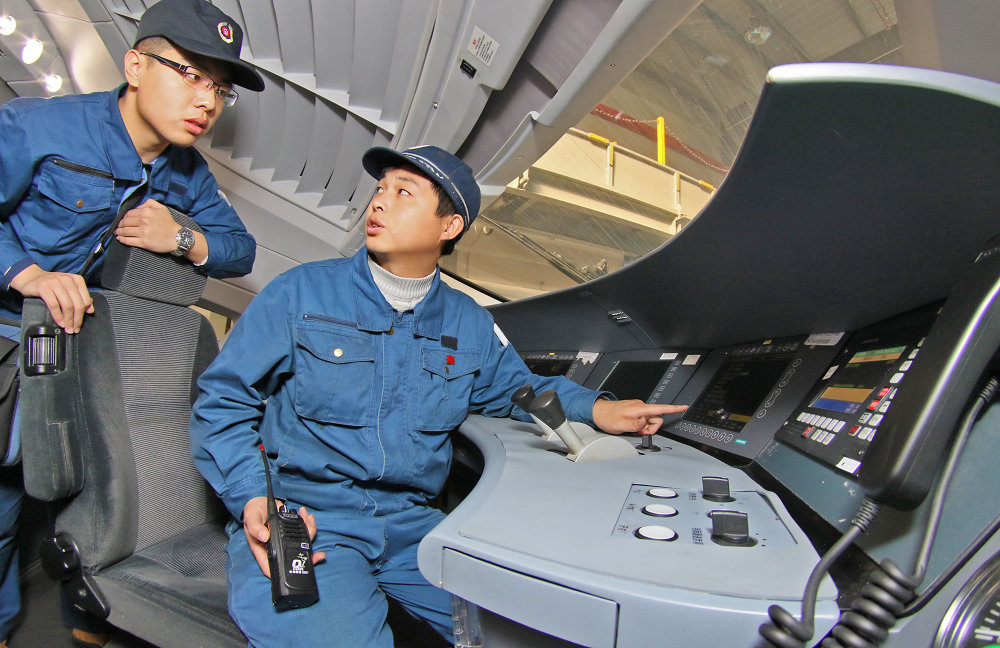 “接車人員已到位,匯報完畢!必撠煓z修的技術人員要在動車組入庫時采取半蹲姿勢檢查一遍輪對的運轉狀態,一趟車大概要用10分鐘!鞍凑照{度命令,今晚有7列動車組入庫檢修,我們必須在天亮前完成每一列動車組升電弓檢測、輪對踏面診斷、靜態檢查、過濾網清潔、內外部保潔、動態檢測等作業項目!币幻夹g人員說。