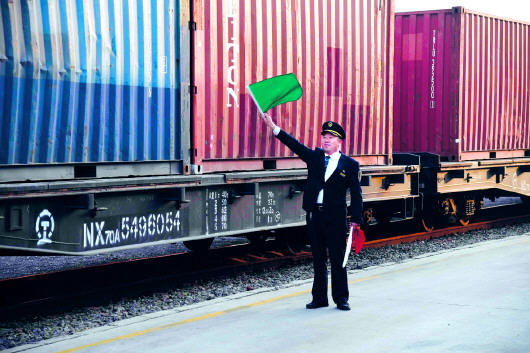 □新華社發(fā) 5月7日,中亞(青島)國(guó)際班列在值班站長(zhǎng)旗語(yǔ)指揮下緩緩開行。