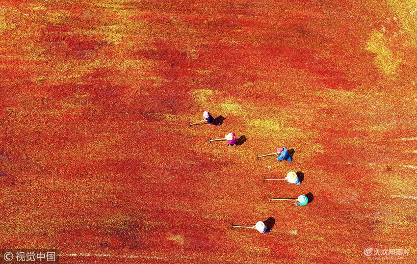 2018年9月6日,山東臨沂,航拍沂南縣玉山中藥材種植專業(yè)合作社員工在晾曬酸棗。