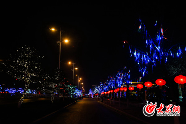 圖為泮河公園北面的新靈山大街,這條道路一直往西就是泰安高鐵站。現在整條道路都被燈光點綴,紅色燈籠和絢麗的燈光交融在一起,營造出一種節日的喜慶氛圍。