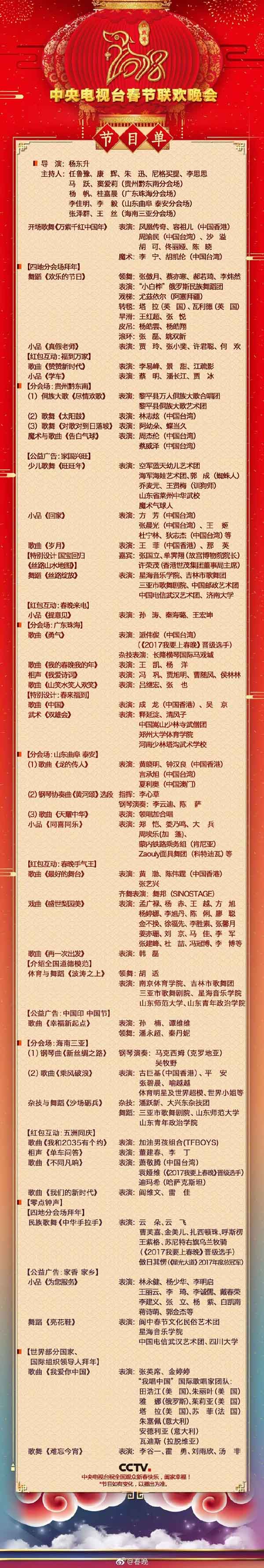 大眾網(wǎng)泰安2月14日訊(記者 邵蕊)一直處于保密狀態(tài)的央視2018年央視春節(jié)聯(lián)歡晚會終于揭開神秘面紗。2月14日晚,央視官方公布春晚節(jié)目單,作為本次晚會的分會場之一,泰安分會場節(jié)目也隨即曝光,分別是20點5分的開場舞表演、22點30分的歌曲《龍的傳人》《天耀中華》以及交響樂《黃河頌》,屆時山東籍明星黃曉明將攜手港澳臺知名演員鐘漢良、言承旭、夏利奧合唱曲目,而著名鋼琴演奏家李云迪、陳薩也將在泰安分會場帶來精彩合奏,而在凌晨跨年時,新年的鐘聲將在岱頂弘德樓幸福敲響,泰安分會場將與全國各地同胞一起共賀新春,祈福祖國在新的一年風(fēng)調(diào)雨順、國泰民安。