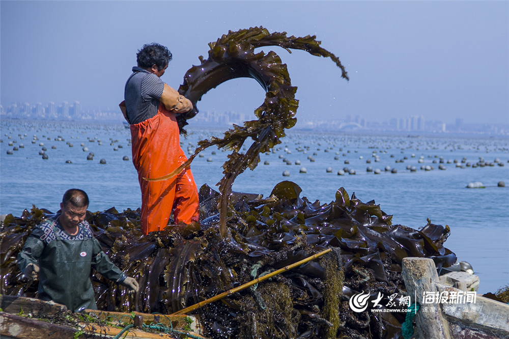 2018年7月,東楮島村附近海區位于桑溝灣的南端,是石島重要的海帶產區。一名熟練的海帶收割工人,在波瀾起伏的海面上,拿著一根前頭帶鐵質彎鉤的工具輕輕伸入水中,使勁一拉,一整片海帶就被拖到收割船上,再用刀具將海帶割開,幾根捆成一捆,橫搭在船上。齊魯網 作者 李 寧 編輯 劉 暢