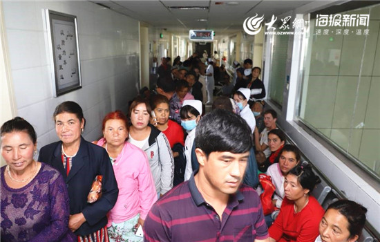 8月23日早上10時(shí)許,英吉沙縣人民醫(yī)院門診樓4樓的半層通道已經(jīng)擠滿患者,看到身著印有“天涯若比鄰,魯疆一家親”字樣T恤的醫(yī)療專家們出現(xiàn),等待的人群一陣騷動(dòng),沒一會(huì),眼科門診前就聚起了長隊(duì)。