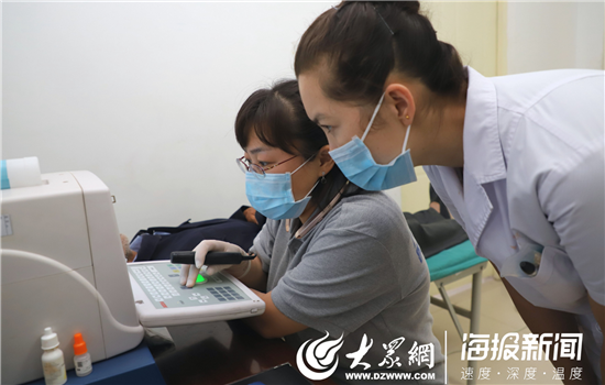 志愿者棗莊市市中區(qū)人民醫(yī)院眼科主任湯靜觀察患者眼部情況。(仇晶 攝)