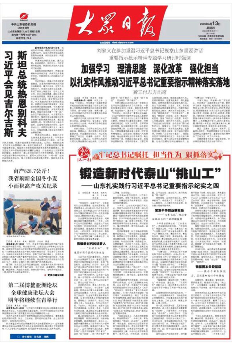 這是時代之問,更是心靈之問。在全黨開展“不忘初心、牢記使命”主題教育,是黨中央的重大決策部署。中央召開會議部署后,6月3日,山東迅速召開工作會議,對全省開展主題教育進行部署,讓學習效果真正體現到增強黨性、提高能力、改進作風、推動工作的成效上來。與會者說,作為山東的干部,不忘初心、牢記使命,就要牢記總書記諄諄教誨,以求實、務實、扎實的作風和態度,真正把總書記重要指示變為新時代現代化強省建設的生動實踐。