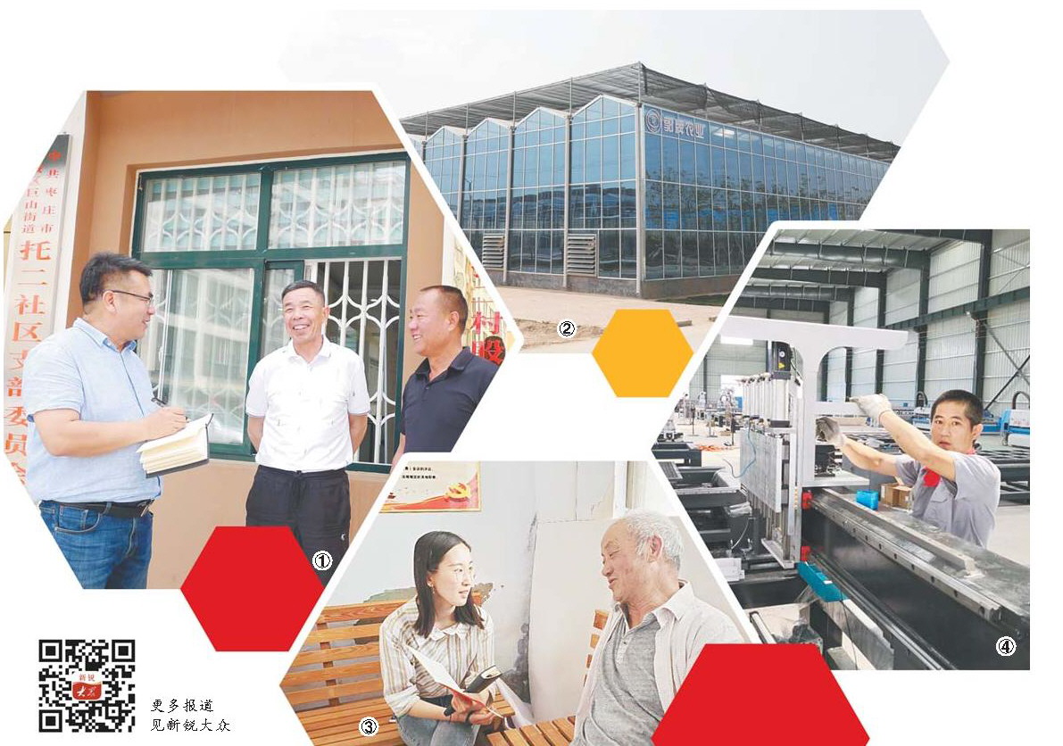 圖①:記者張環(huán)澤(左一)圍繞農(nóng)村集體產(chǎn)權制度改革等話題,采訪棗莊市薛城區(qū)巨山街道東托二村村民。 圖②:寒亭國家現(xiàn)代農(nóng)業(yè)產(chǎn)業(yè)園是濰坊綜試區(qū)核心區(qū)內(nèi)重點在建項目之一,圖為落戶園區(qū)一家企業(yè)的玻璃溫室。 圖③:記者毛鑫鑫(左)采訪臨沭縣石門鎮(zhèn)大官莊村村民,了解農(nóng)業(yè)種植新模式。 圖④:禹城辛店鎮(zhèn)萬創(chuàng)工業(yè)園讓農(nóng)民實現(xiàn)了在家門口就業(yè)。