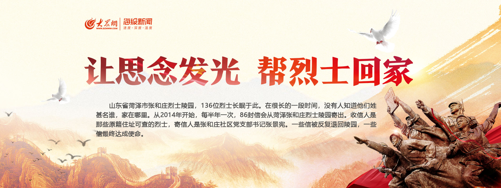 戰爭年代你為我們保家衛國,和平年代我們幫你落葉歸根。“讓思念發光,幫烈士回家”大型尋親活動啟動以來,大眾網·海報新聞...