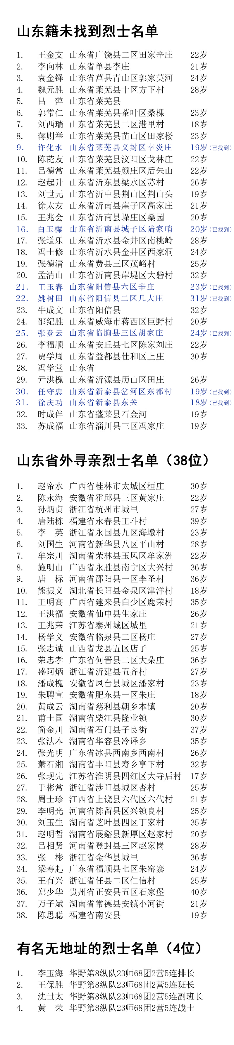本次活動(dòng)立足山東、輻射全國,對(duì)于山東省籍的33位烈士,將采取線上及電話征集線索與線下實(shí)地尋訪核驗(yàn)的方式幫助烈士尋親;對(duì)于其他省份來源的38位烈士以及4位無具體家庭地址的烈士,將重點(diǎn)采取線上及電話征集線索、必要時(shí)輔之以實(shí)地尋訪核驗(yàn)的方式幫助烈士尋親。
