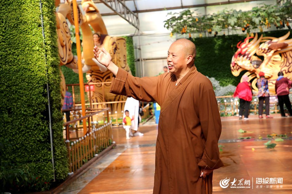 延參法師在壽光菜博會現(xiàn)場直播,向網(wǎng)友介紹菜博會景觀。