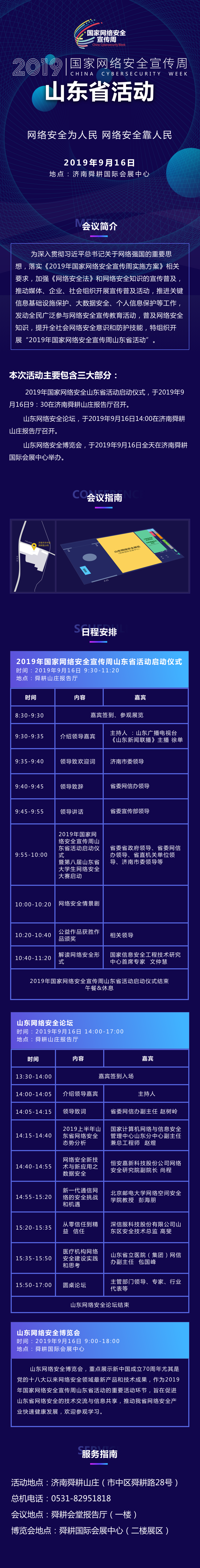 除網絡安全技能大賽、網絡安全論壇、網絡安全博覽會外,在山東省教育廳、省通信管理局、省公安廳、中國人民銀行濟南分行、團省委、省總工會、省婦聯等有關部門的參與和支持下,宣傳周期間,山東還將舉行校園日、電信日、法治日、金融日、青少年日、個人信息保護日,六個“主題日活動”。