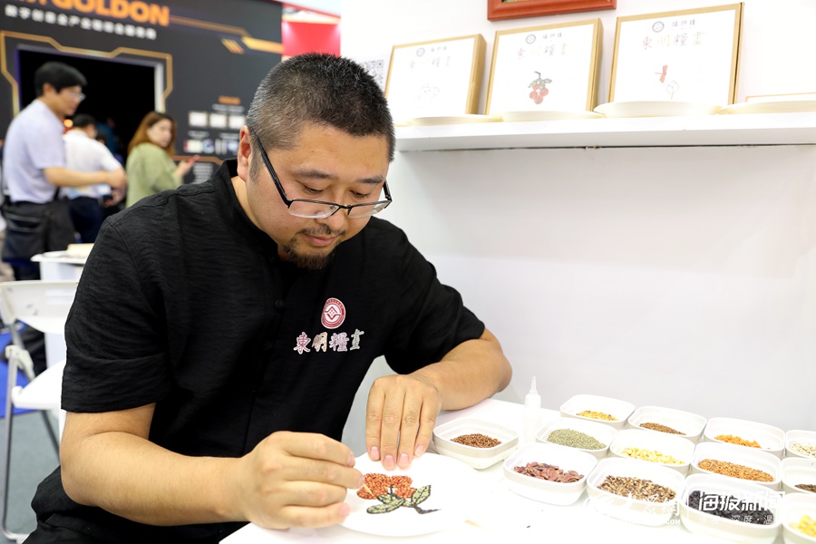 在深圳文博會山東展區,東明糧畫制作技藝傳承人韓國瑞正在進行創作。