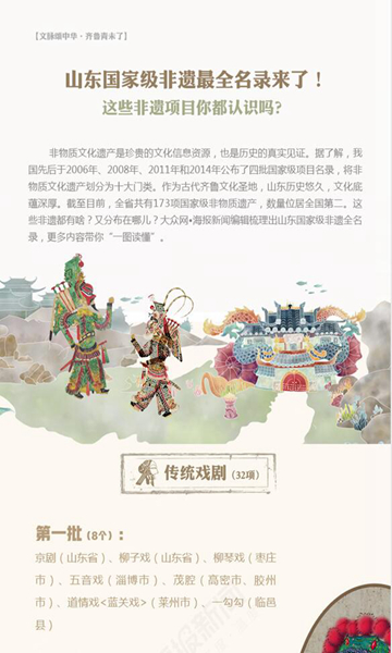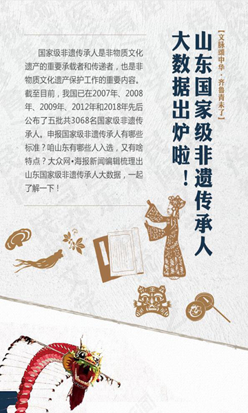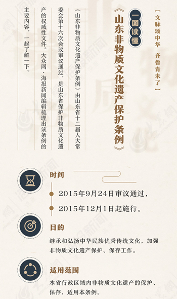《山東非物質文化遺產保護條例》由山東省十二屆人大常委會第十六次會議審議通過,是山東省保護非物質文化遺產的權威性文件。大眾網?海報新聞編輯梳理出該條例的主要內容,一起了解一下。 [詳細]