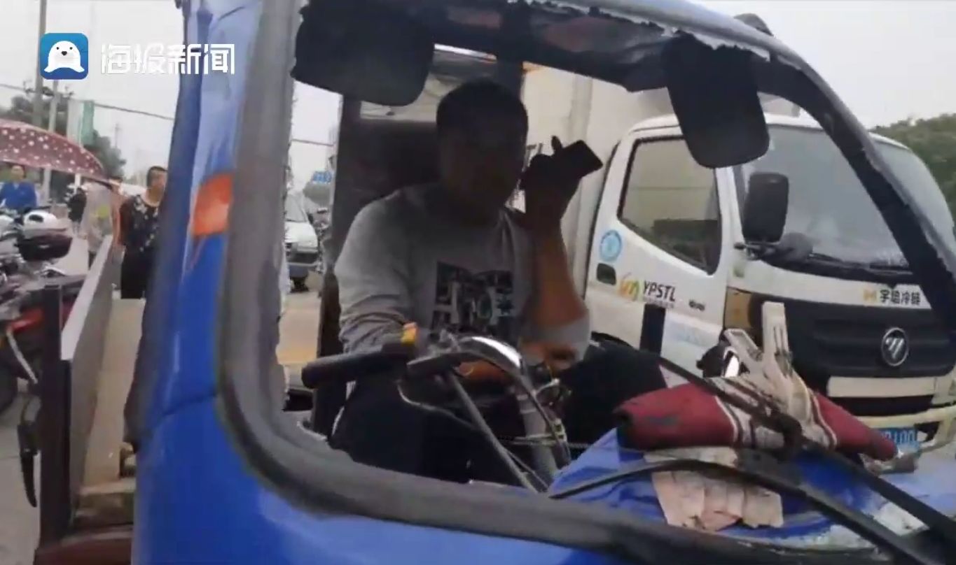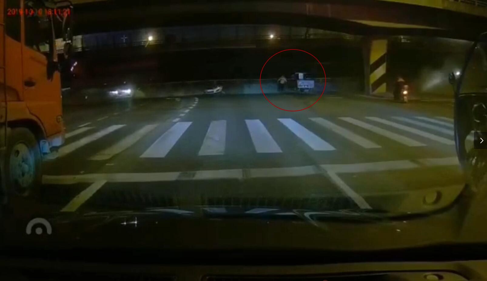 無錫上跨橋側翻瞬間,橋下一三輪車主跳車逃生。
