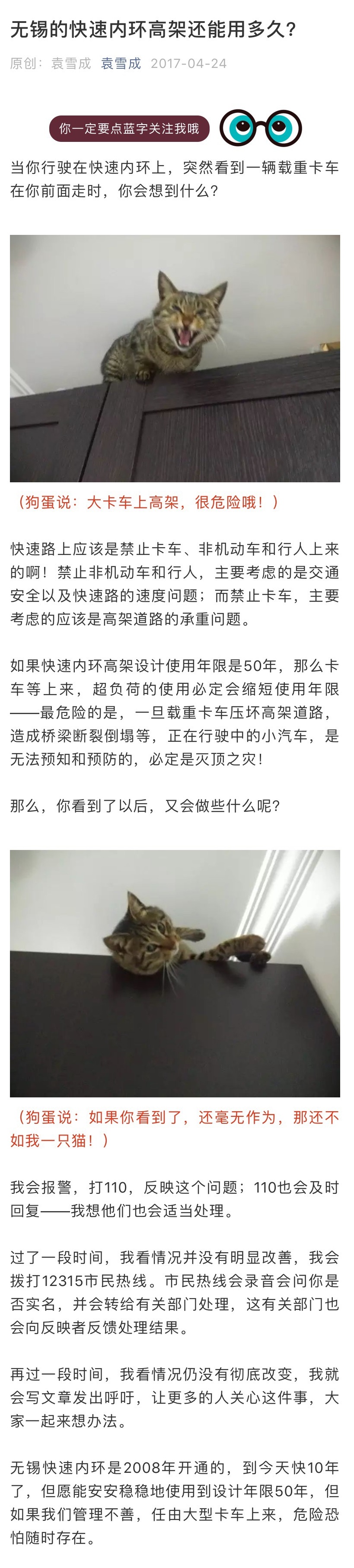 實(shí)際上,對于卡車駛上高架橋,早就有自媒體發(fā)文對其中的安全隱患表示擔(dān)憂。自媒體賬號袁雪成2017年發(fā)布的一篇《無錫的快速內(nèi)環(huán)高架還能用多久?》在此次事故的當(dāng)晚就開始刷屏,文中說,一旦載重卡車壓壞高架道路,造成橋梁斷裂倒塌等,正在行駛中的小汽車,是無法預(yù)知和預(yù)防的必定是滅頂之災(zāi)。