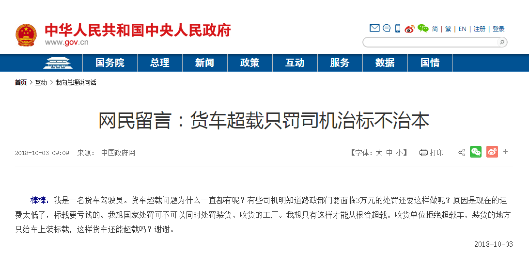 而對于解決貨車超載問題,記者注意到,2018年曾有自稱貨車駕駛員的網(wǎng)民在中國政府網(wǎng)上留言稱,貨車超載只罰司機(jī)治標(biāo)不治本。這位網(wǎng)友說,“貨車超載問題為什么一直都有呢?有些司機(jī)明知道路政部門要面臨3萬元的處罰還要這樣做呢?原因是現(xiàn)在的運(yùn)費(fèi)太低了,標(biāo)載要虧錢的。我想國家處罰可不可以同時(shí)處罰裝貨、收貨的工廠。我想只有這樣才能從根治超載。收貨單位拒絕超載車,裝貨的地方只給車上裝標(biāo)載,這樣貨車還能超載嗎?”
