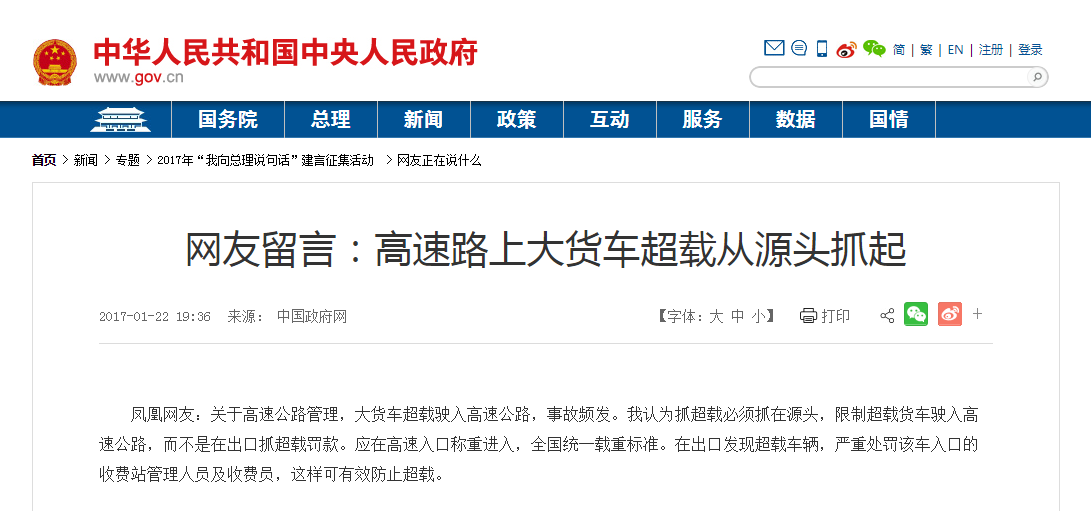 此前,2017年也曾有網(wǎng)友在中國政府網(wǎng)上留言稱,“我認(rèn)為抓超載必須抓在源頭,限制超載貨車駛?cè)敫咚俟罚皇窃诔隹谧コd罰款。應(yīng)在高速入口稱重進(jìn)入,全國統(tǒng)一載重標(biāo)準(zhǔn)。在出口發(fā)現(xiàn)超載車輛,嚴(yán)重處罰該車入口的收費(fèi)站管理人員及收費(fèi)員,這樣可有效防止超載。”