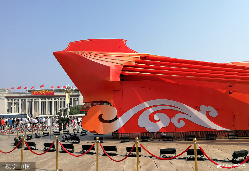 2019年10月2日,北京,“中華兒女”國慶主題彩車亮相天安門廣場,吸引游客觀賞拍照。