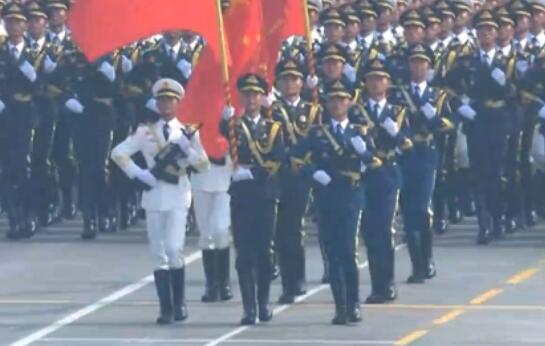 記者看到,儀仗方隊(duì)護(hù)衛(wèi)黨旗、國(guó)旗、軍旗三面旗幟走在徒步方隊(duì)的最前方,引領(lǐng)受閱大軍接受檢閱。